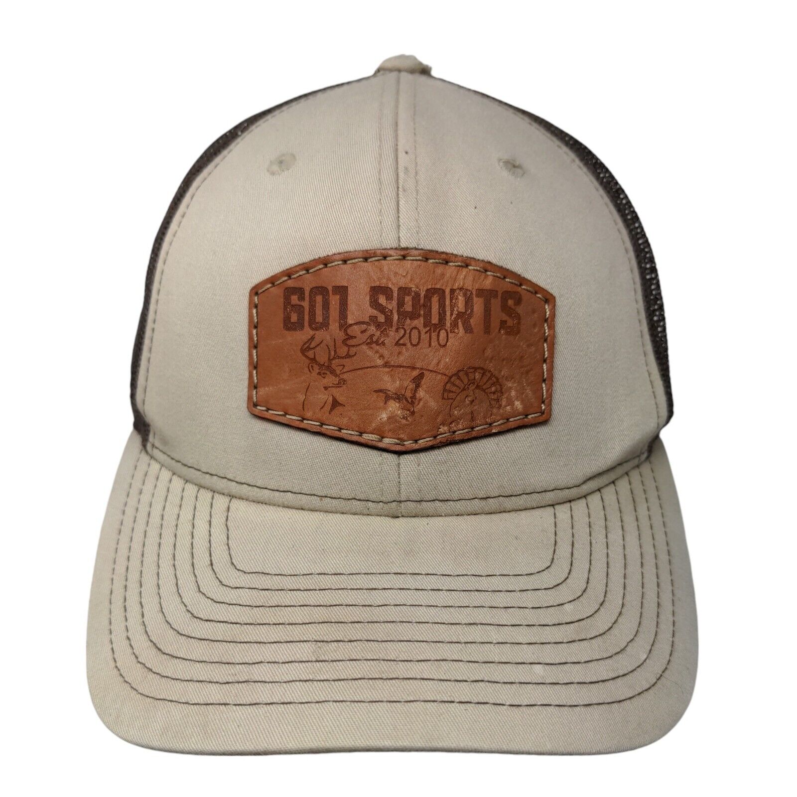 607 Sports Snapback Mesh Back Trucker Hat Tan One Size Leather Patch