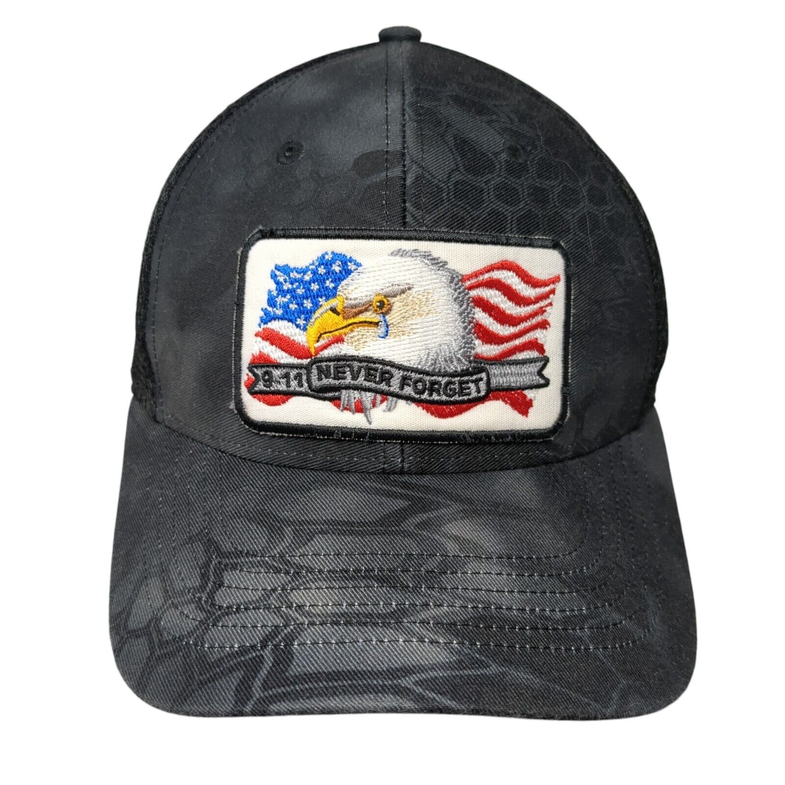 911 Never Forget Fitted Mesh Back Hat Camo S/M American Flag Eagle