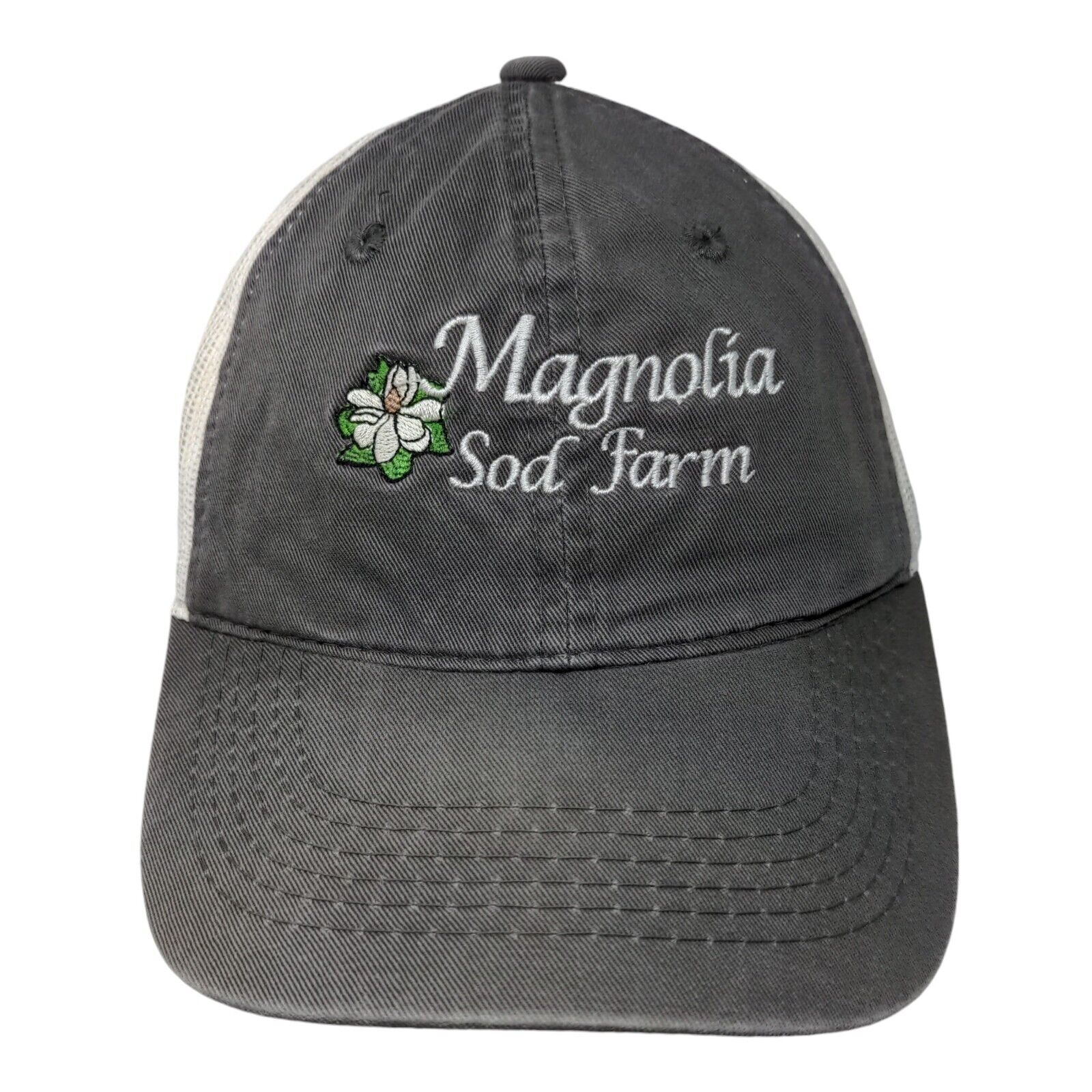 Magnolia Sod Farm Strapback Mesh Back Trucker Hat Gray OSFM ColorblockCondition: This Outdoor Cap Hat has blemishes on both inside...