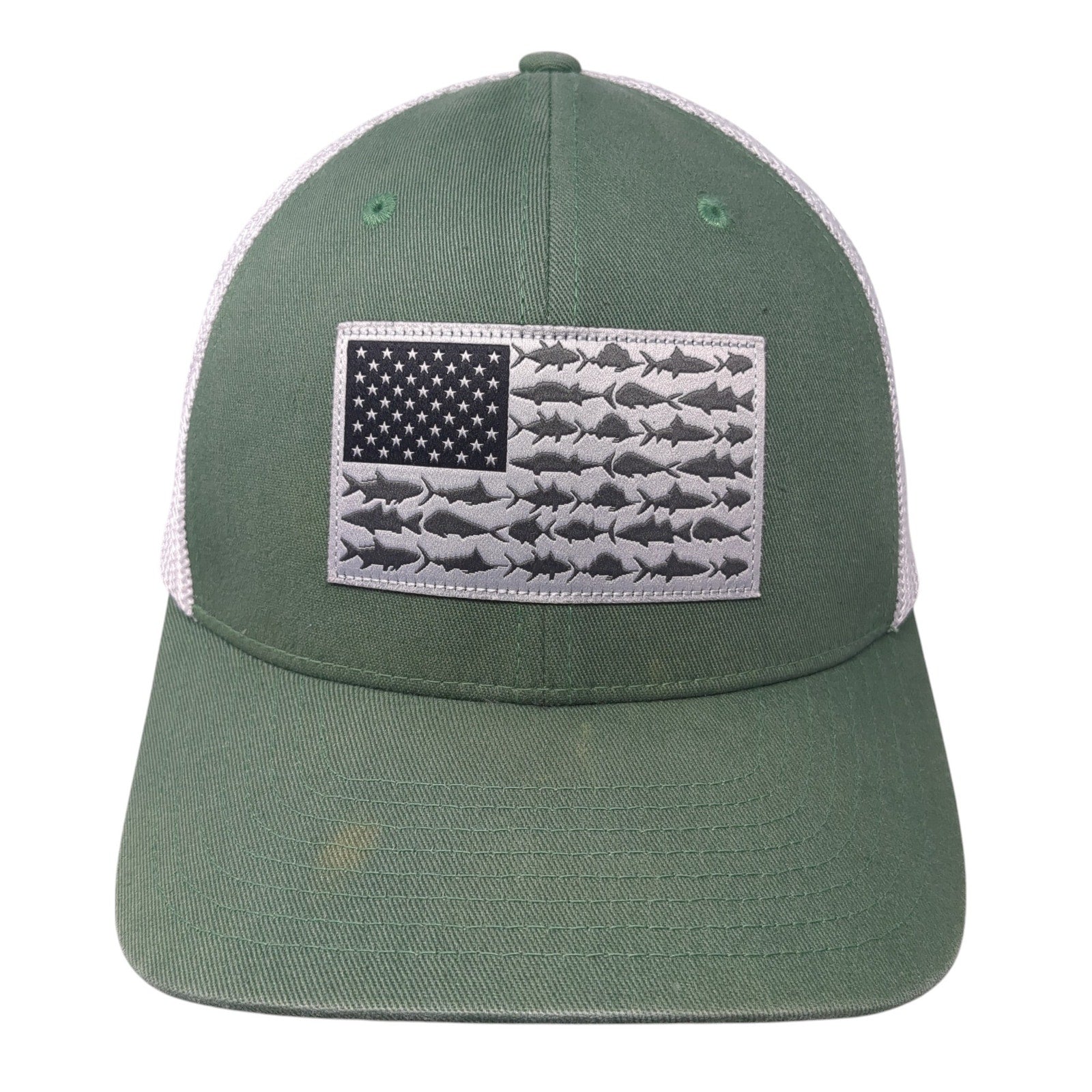USA Fish Flag Fitted Mesh Back Trucker Hat Green One Size PFG ColumbiaCondition: This hat has blemishes on both the...