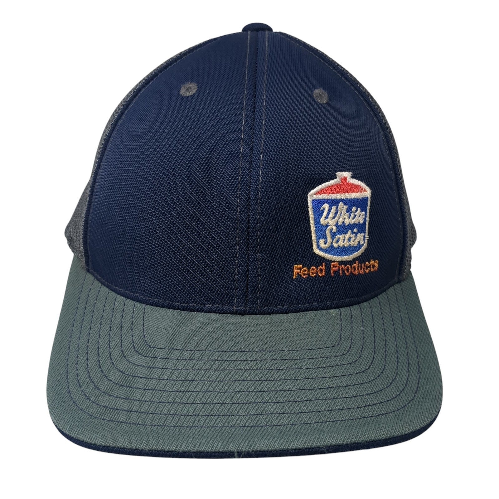 White Satin Feed Products Fitted Baseball Cap Multicolor 8 Mesh Pacific HeadwearCondition: This hat has blemishes on both the inside...