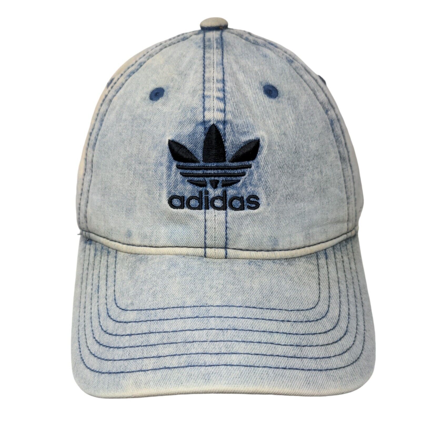 Adidas Slideback Hat Blue OS Adjustable Embroidered Trefoil Acid Wash DenimCondition: This Adidas Hat has blemishes on both inside and...