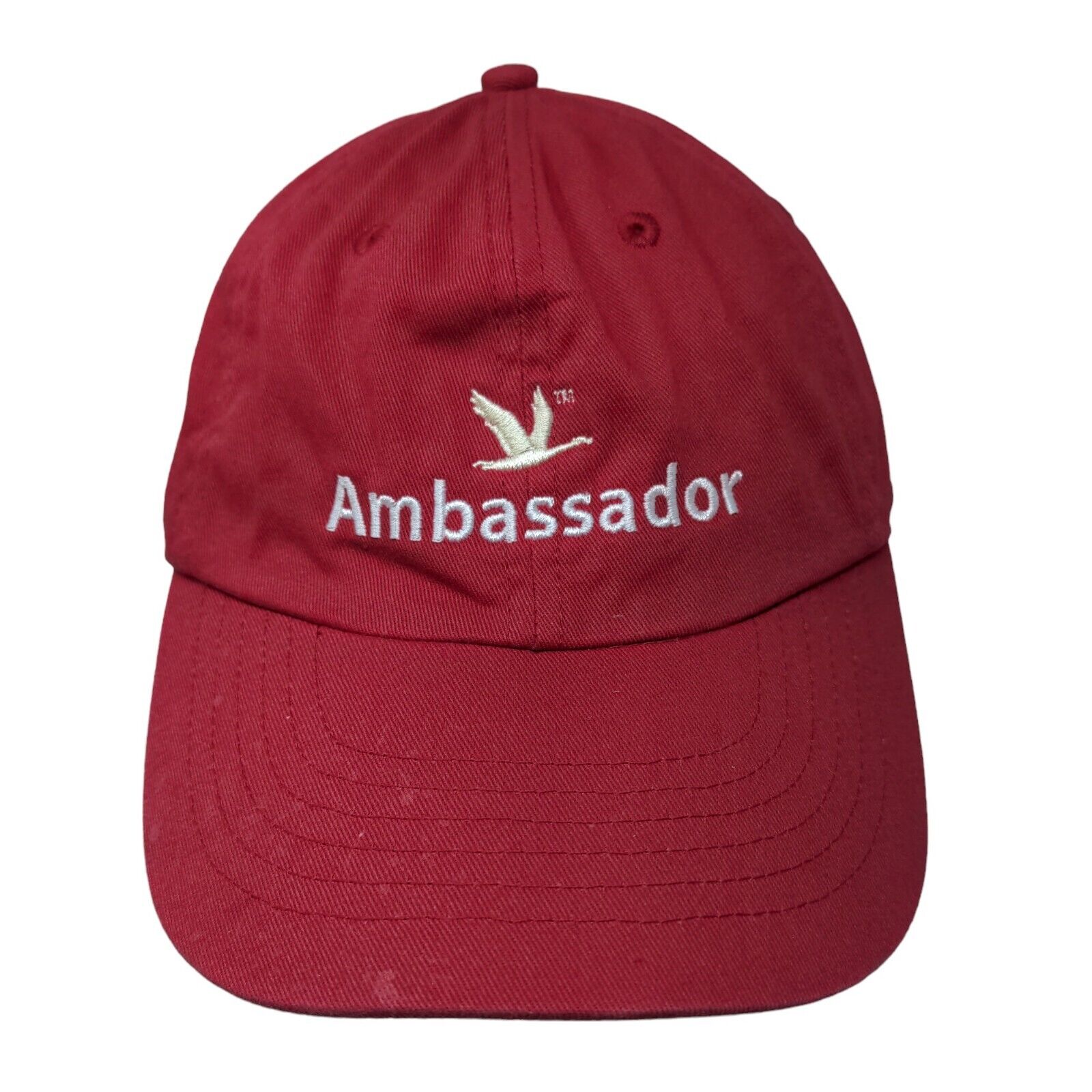 Ambassador Strapback Hat Red OSFM Embroidered Adjustable Vent HolesCondition: This Ambassador Hat has blemishes on both inside and outside. Sold...
