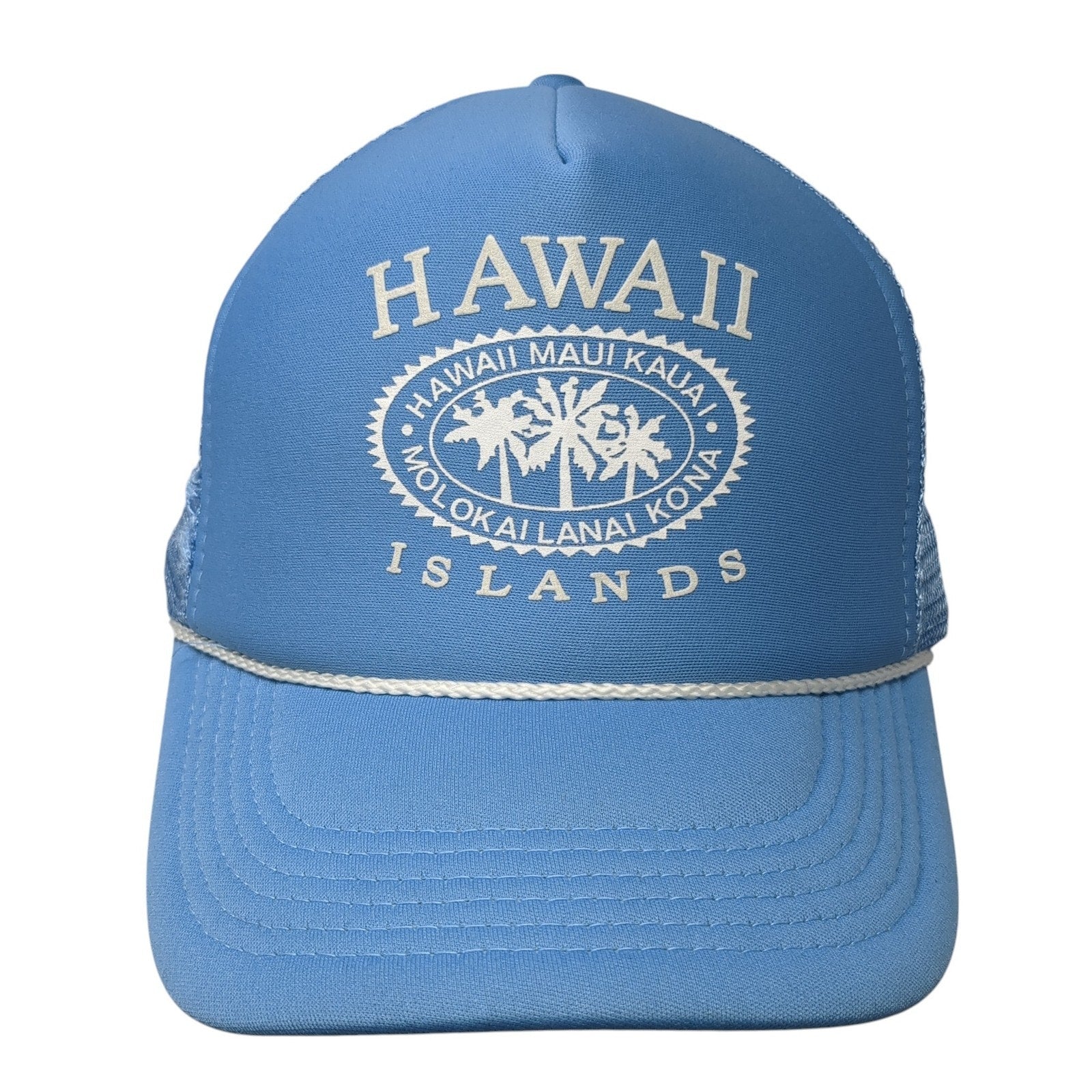Hawaii Islands Molokai Lanai Kona Trucker Hat Blue OS Adjustable Mesh Back Rope