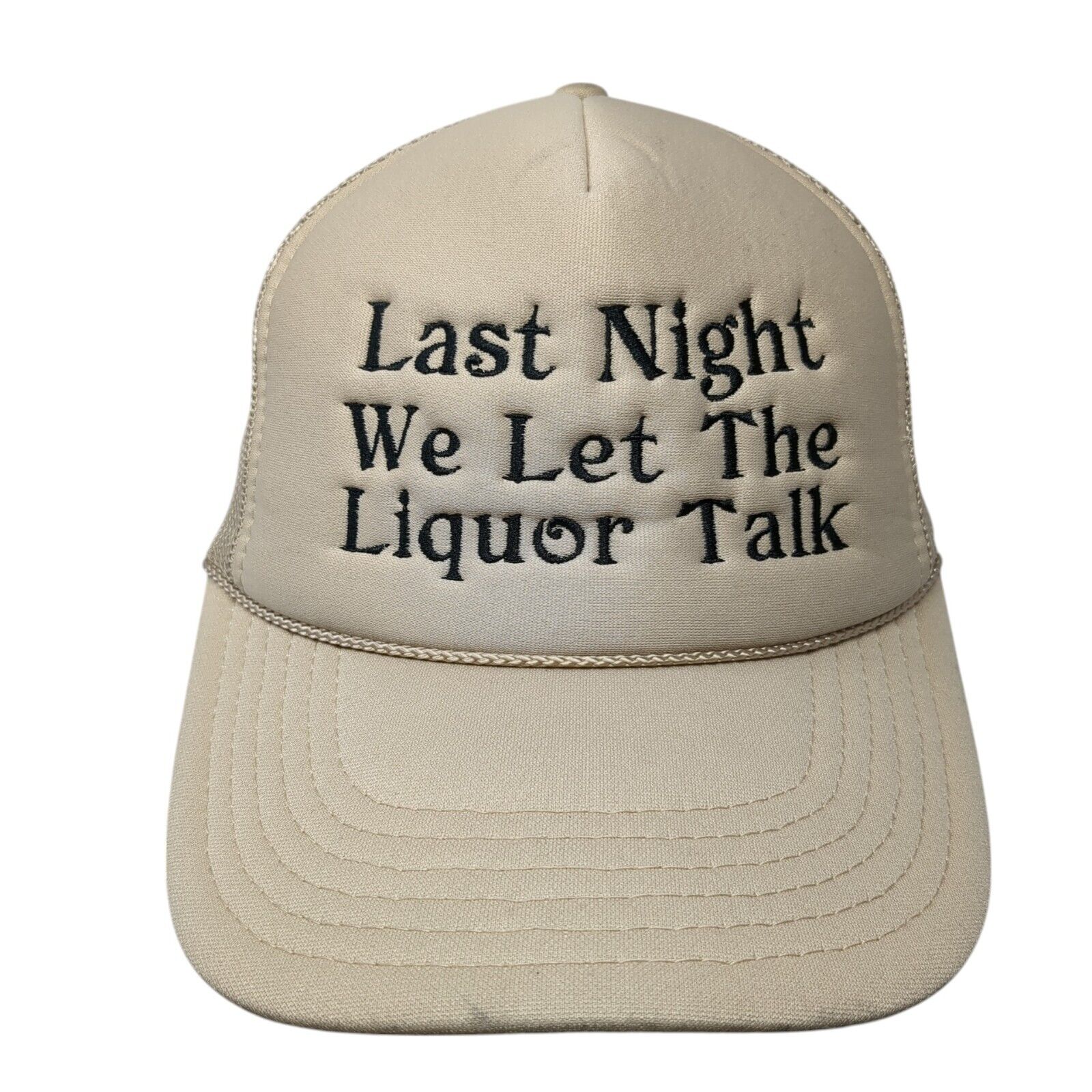 Last Night We Let The Liquor Talk Snapback Rope Trucker Hat Tan One Size