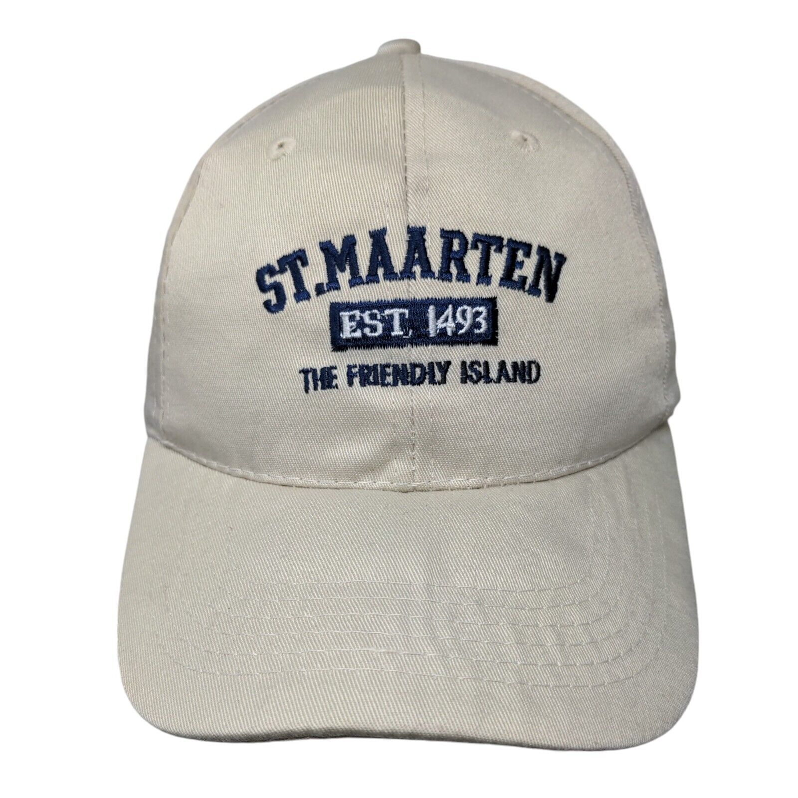 St. Maarten The Friendly Island Strapback Hat Tan OSFA EmbroideredCondition: This Unbranded Hat has blemishes on the inside. Sold as...